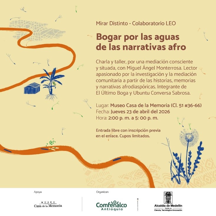 Ese mismo día, en el Museo Casa de la Memoria, tendremos el primer encuentro de Mirar Distinto – Colaboratorio LEO: Bogar por las aguas de las narrativas afro, una tarde de conversación y práctica junto a Miguel Ángel Monterrosa, quien nos hablará de la diáspora afro como un campo dinámico de producción de historias, memorias, lenguajes y estéticas.